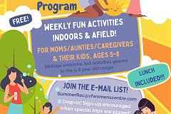 The Moms and Kids Summer Rec Program runs mid-June to late August and is for moms, aunties, and caregivers of all kinds, along with their kids ages 5 to 8. Siblings are welcome, but activities will be geared toward 5 to 8 year olds.